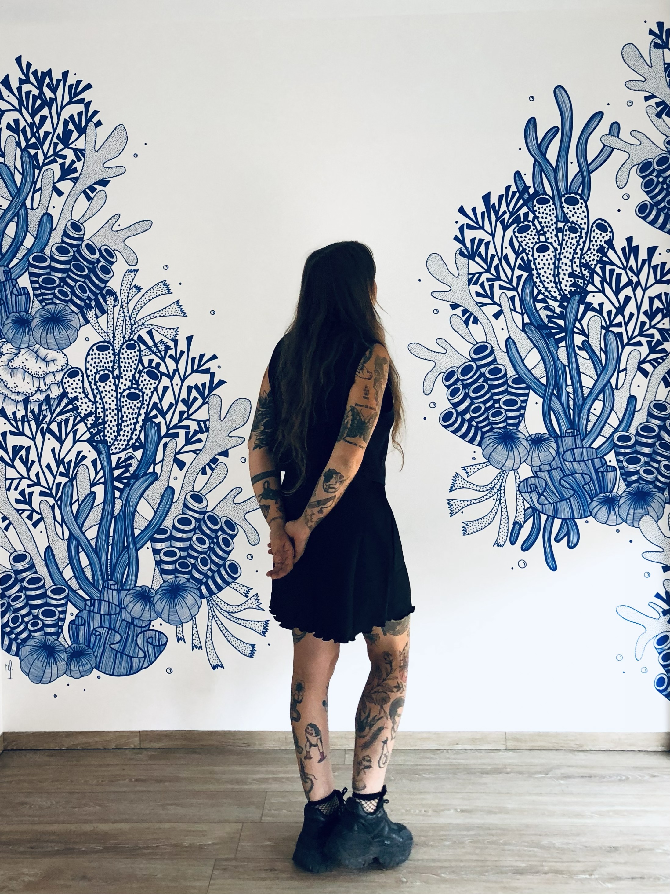 Nina Faustine est peintre en décor & illustratrice, son atelier est basé entre Angers et Nantes. Artiste aux pratiques multiples, Nina réalise des décors muraux artistiques et des scénographies. Parallèlement, elle anime de nombreux ateliers participatifs tout public et fait partie de plusieurs associations. Elle présente également ses illustrations lors d’expositions personnelles ou collectives. Au travers ces disciplines, elle nous propose une esthétique naturaliste, graphique et décorative. Ses œuvres reposent principalement sur l’utilisation de lignes détaillées et texturées ainsi que sur un traitement fluide des formes. Elle adopte une palette de couleurs restreinte, souvent monochrome, lui permettant de mettre en avant les détails et les contrastes. Nina nous invite à voyager entre mondes oniriques et femmes puissantes. Plongez dans son univers hybride et poétique !